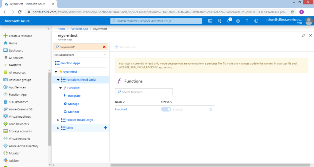8. You can navigate to functions in azure portal from the left navigation drawer.As you can see in the below screenshot our reycrmtest App is created on Azure portal.