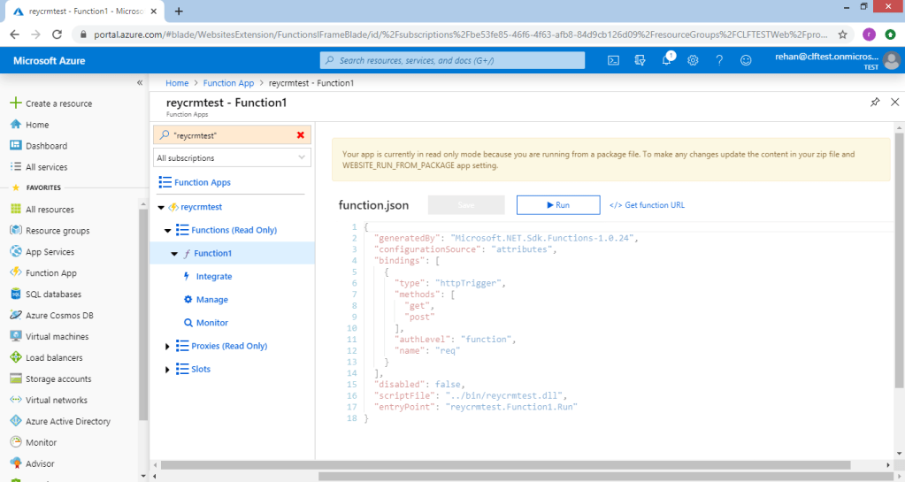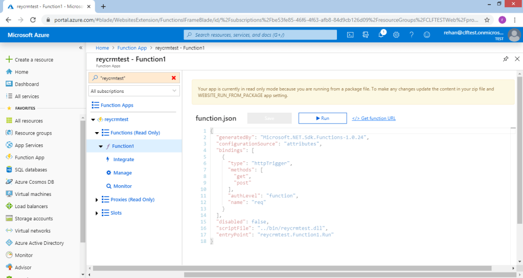 9. Click On function1 to see function.json. It will be in readonly mode as we have deployed the function from Visual studio Cloud service .Get the function URL besides Run button and paste it on notepad.We will use this URL while registering Webhook.