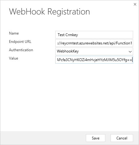 | WebhookKey | Includes a query string using code as the key and a value required by the endpoint. When registering the web hook using the Plug-in Registration tool, only enter the value.Example: ?code=00000000-0000-0000-0000-000000000001 |