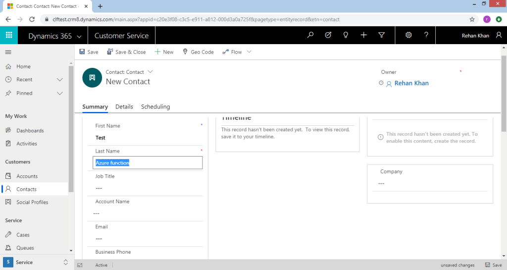 Now navigate to the CRM instance and create (or perform the step as per your registration) a record. I have created a contact record in my instance as shown below.