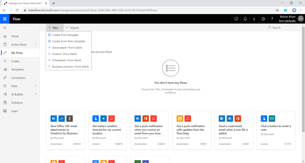 Lets start with flow creation on http://flow.microsoft.com/ log in with your Dynamics user credentials.You will land on homepage as below.