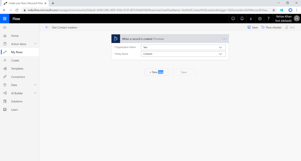 Now you can type-in the name of your flow and choose the trigger point for the flow, here i am triggering the flow on create of record (Dynamics 365 connector). There are 2 trigger available in which one is in preview mode you can select any one of them.Once you click on create button you can see flow designer.