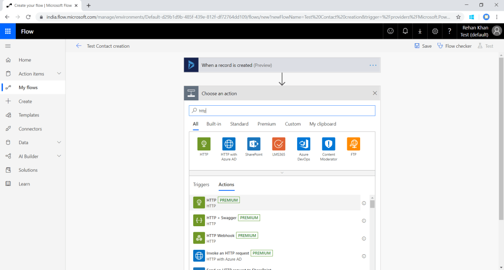 Add HTTP step which will trigger an API request to the URL. Click on new step and type HTTP. Now select HTTP [premium] which is a premium flow plan you will get the plan details here .HTTP actions are designed to manage HTTP requests in flow.