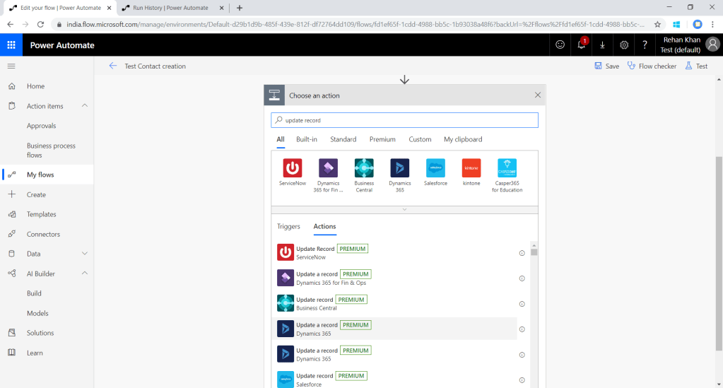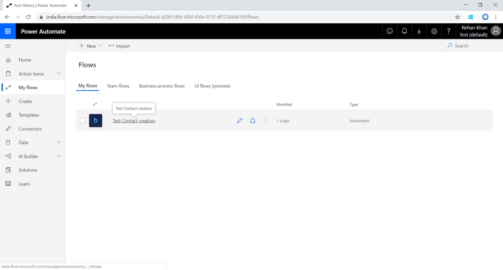 We can check the logs for all the execution in flow.Navigate to My Flows>Select your flow(I am selecting Test contact creation)