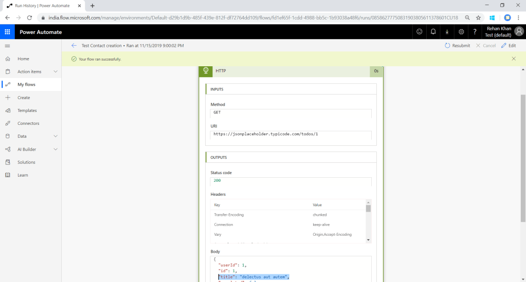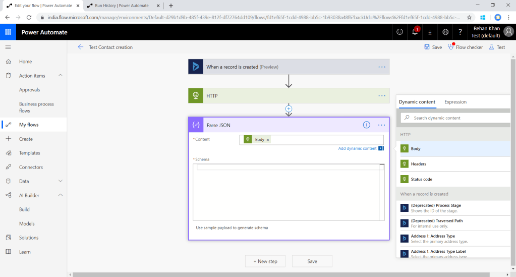 After performing the above steps FLOW will execute this API request,but to capture the response from API we will parse the response structure.Add new step and select parse json action.