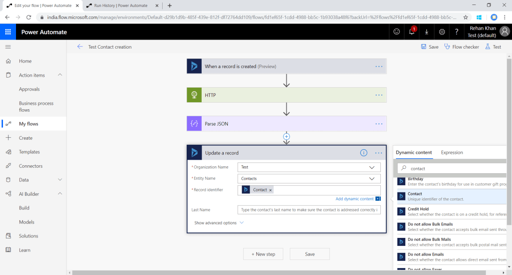 Select your environment following that select the entity which you want to update that is contact in this example.There is a mandatory field record identifier which requires the GUID of the record you want to update .Here we will pass unique identifier record of contact which will be originated from create step as shown in the above screenshot.