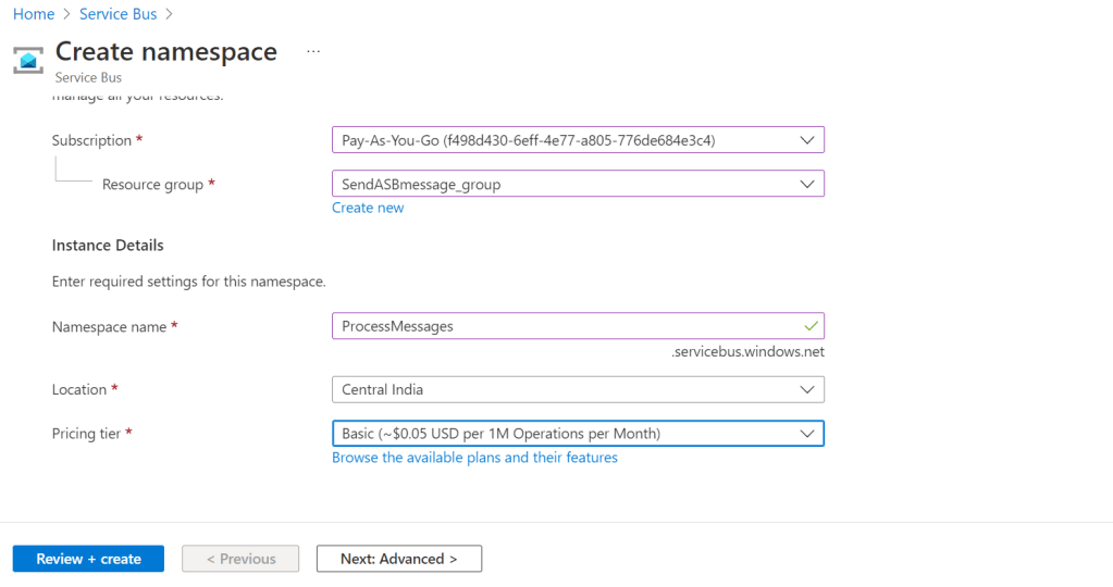 Namespace Name -Add your preferred namespace for the Azure service bus.