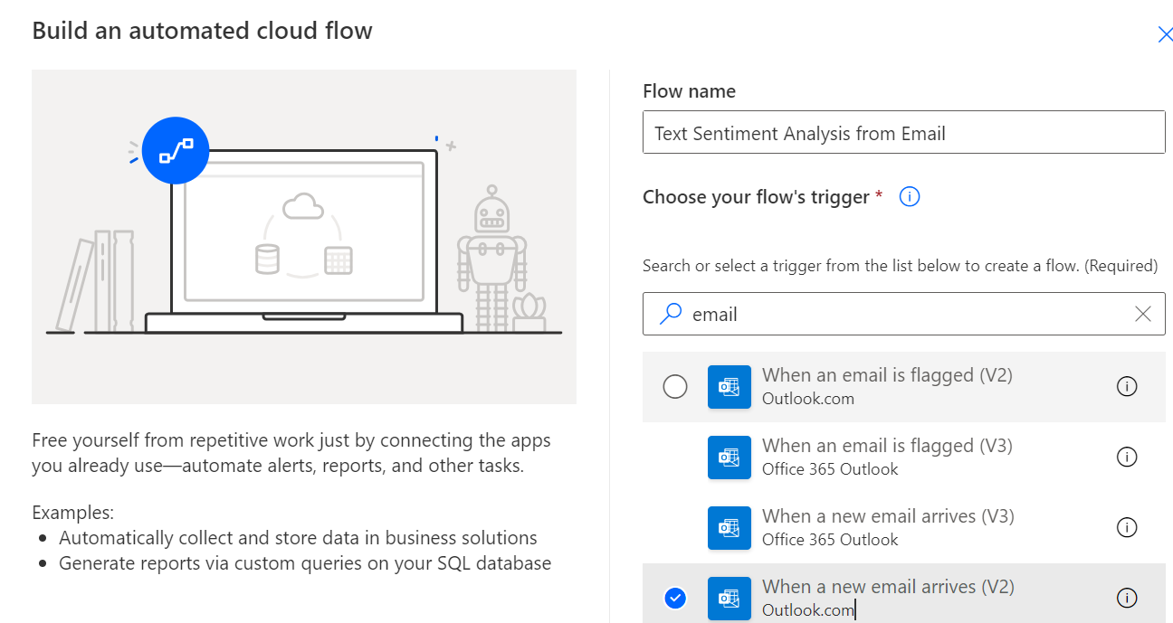 Create a new automated flow .I will demonstrate using Outlook connector when a new email arrives.