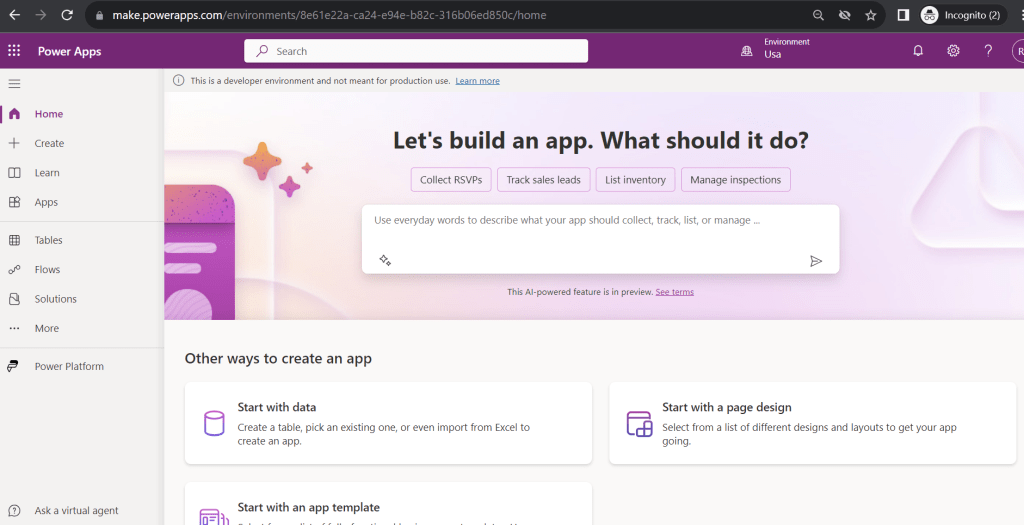Please note you will need Developer environment in USA region as Co pilot feature is available in preview feature in US region .