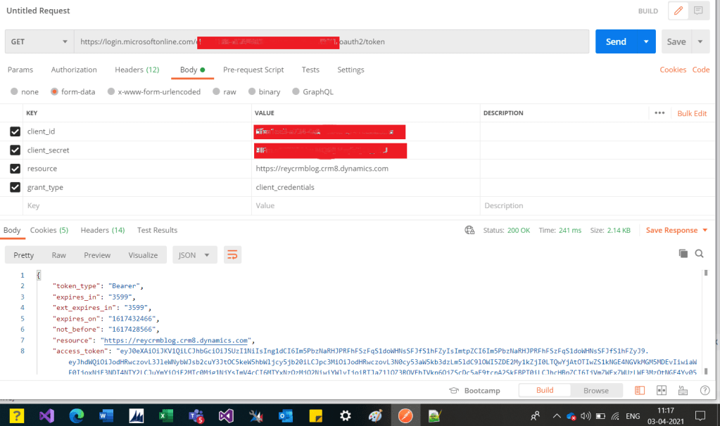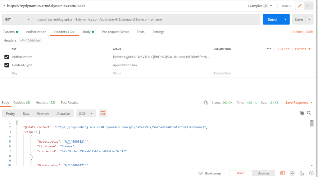 Now we can test the custom API in postman. Please note we are using OOB WEB API registered in AZURE. To know how to register dynamics 365 WEB API on azure you can refer to my blog How to register D365 WEB API.
